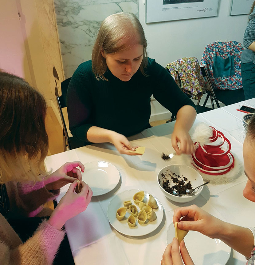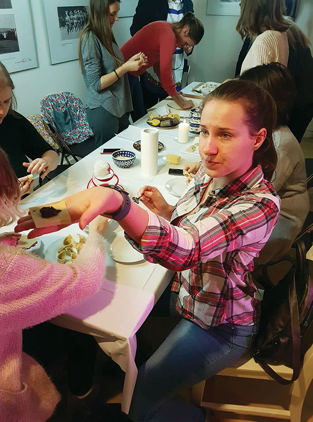 Przy drugim stole lepiono uszka do wigilijnego barszczu. To dość skomplikowany proces, ale dzięki pomocy większej liczby osób zakończony sukcesem – ciasto zostało rozwałkowane, pocięte na kwadraty, napełnione grzybowym nadzieniem i sklejone. Świąteczną atmosferę tworzyła też muzyka fortepianowa w wykonaniu Zuzany Obertovej, której na flecie towarzyszyła Barbora Horáčková, a na skrzypcach Katarína Hudáčková, wszyscy zaś wspierali muzyków śpiewem.