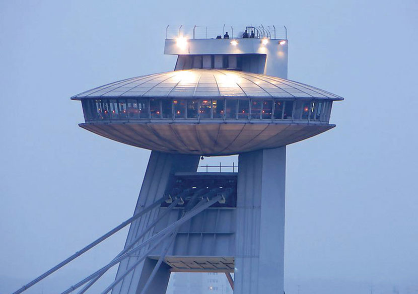 Do restauracji, niegdyś funkcjonującej jako Bystrica, ale przez mieszkańców od zawsze nazywanej po prostu UFO, dowozi gości specjalna, szybkobieżna winda. Architekci wmontowali ją w lewy filar pylonu, w prawym zaś umieszczono schody awaryjne – prawdziwy cud techniki i, moim zdaniem, jeszcze jeden powód, by spoglądać na most SNP oczami wielkimi z zachwytu jak (kosmiczne) spodki.