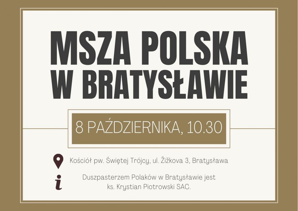 Najbliższa msza święta w języku polskim w Bratysławie odbędzie się w niedzielę, 8 października, o godz. 10.30 w kościele pw. Świętej Trójcy (ul. Žižkova 3). Duszpasterzem Polaków w Bratysławie jest ks. Krystian Piotrowski SAC.